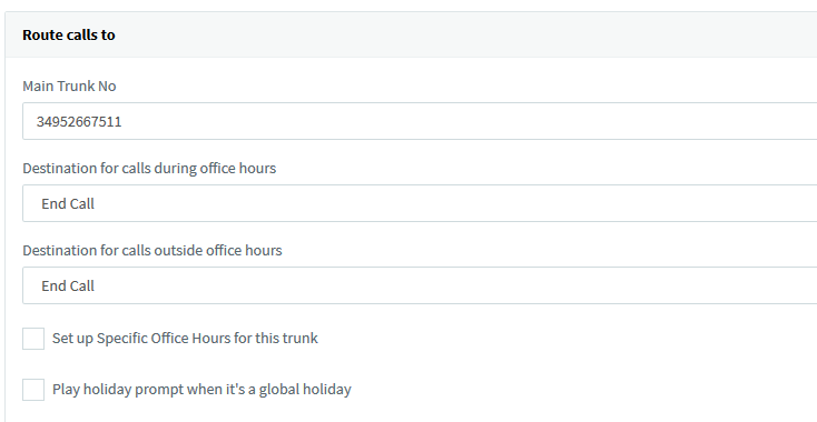Under "Route calls to," you can set the Main Trunk No you typed at the beginning when creating the SIP Trunk to assign it to a group or an extension.