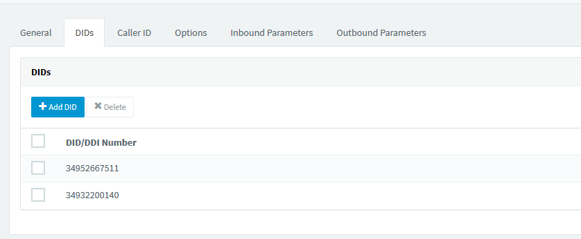 To add Inbound DIDs, go inside the SIP Trunk configuration, open the tab "DIDs," and in this section, you can add all the inbound numbers you bought from Megacall. Remember, numbers must always include the International prefix; do not add "00" or "+" in front of the country prefix.