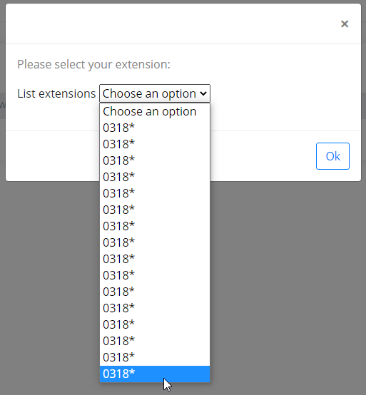 We will now see a screen which has a dropdown containing a list of extensions. Here we need select our own extension number. It is important to select our extension as this will determine which phone will ring (for us to be able to barge-in to the call). Once selected we need to click on OK