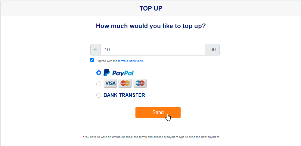 Once in the top-up area, you can choose one of the payment options supported by your country. You will need to input the amount you wish to top-up, then check the box agreeing to the Terms & Conditions and then click on the "Send" button, you will then be re-directed to the vendor payment portal.