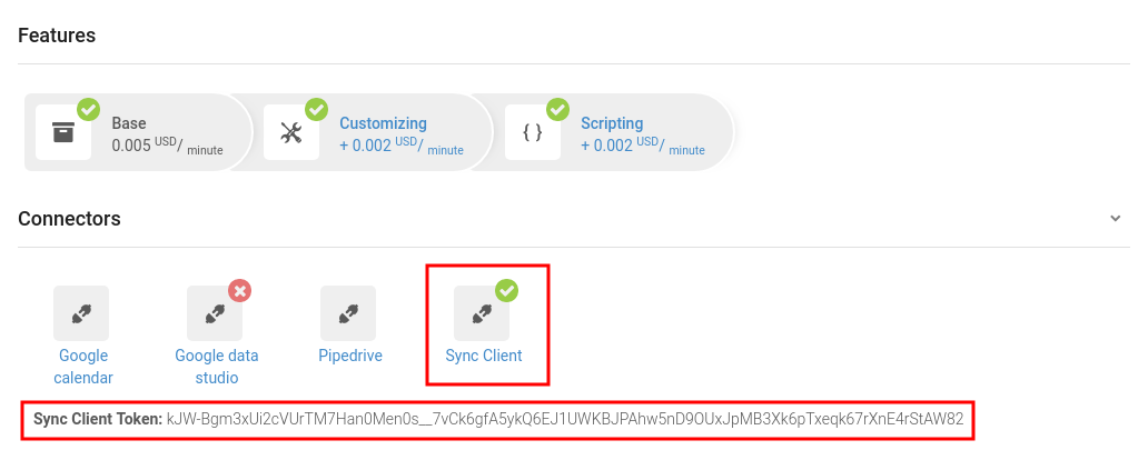 Para poder utilizar el Cliente de sincronización, active el conector correspondiente en la configuración de la campaña. Después de la activación exitosa, se muestra un token debajo de los conectores. Es necesario para utilizar el cliente. El token sólo es visible para el usuario que ha activado el conector.