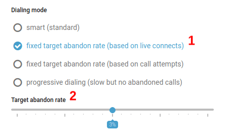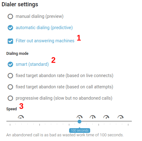 In predictive dialing you have the option to avoid connecting answering machines (1) and you can select one of the four dialing modes starting with the smart (standard) (2):