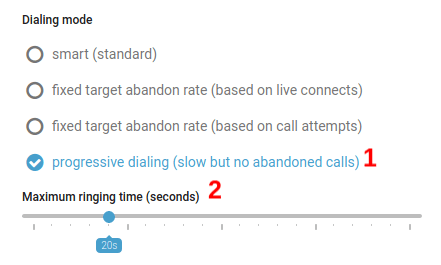 Finally there is the option of progressive dialing (1) which is where the dialer will call contacts automatically, but will do them on a one by one basis for a set duration (which you can change using the slider). Once this maximum ringing time has been reached it will stop the call and move on to the next one.